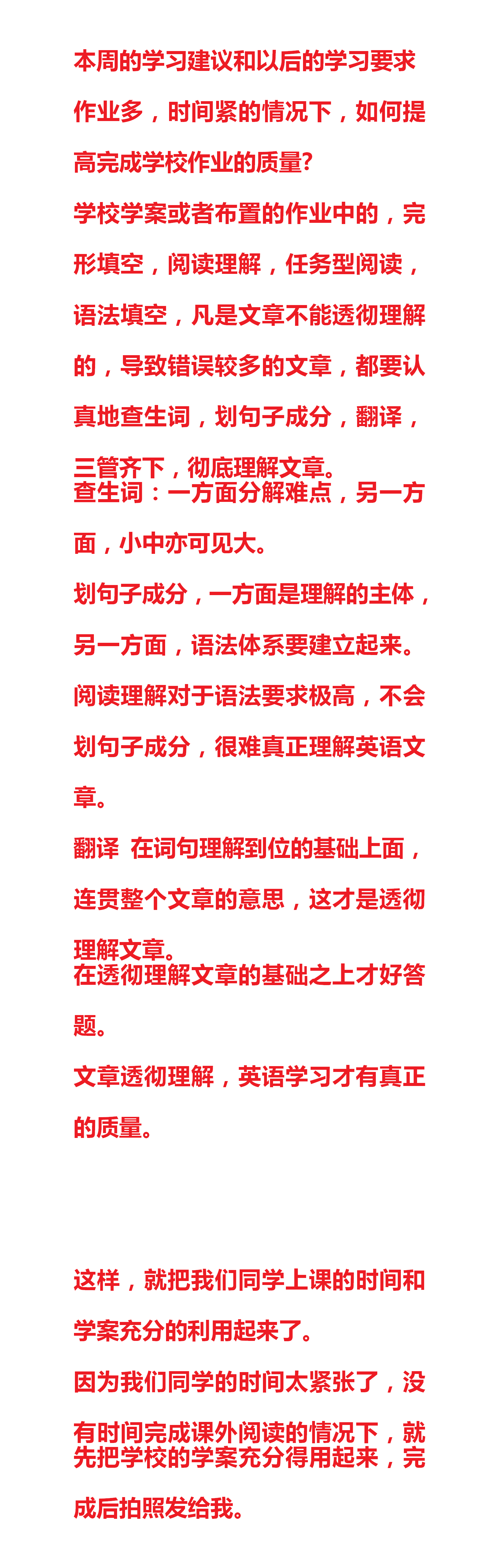 学校学案或者布置的作业中的,完形填空,阅读理解,任务型阅读,语法填空,凡是文章不能透彻理解的,都要认真地查生词,划句子成分,翻译,三管齐下,彻底理解文章。